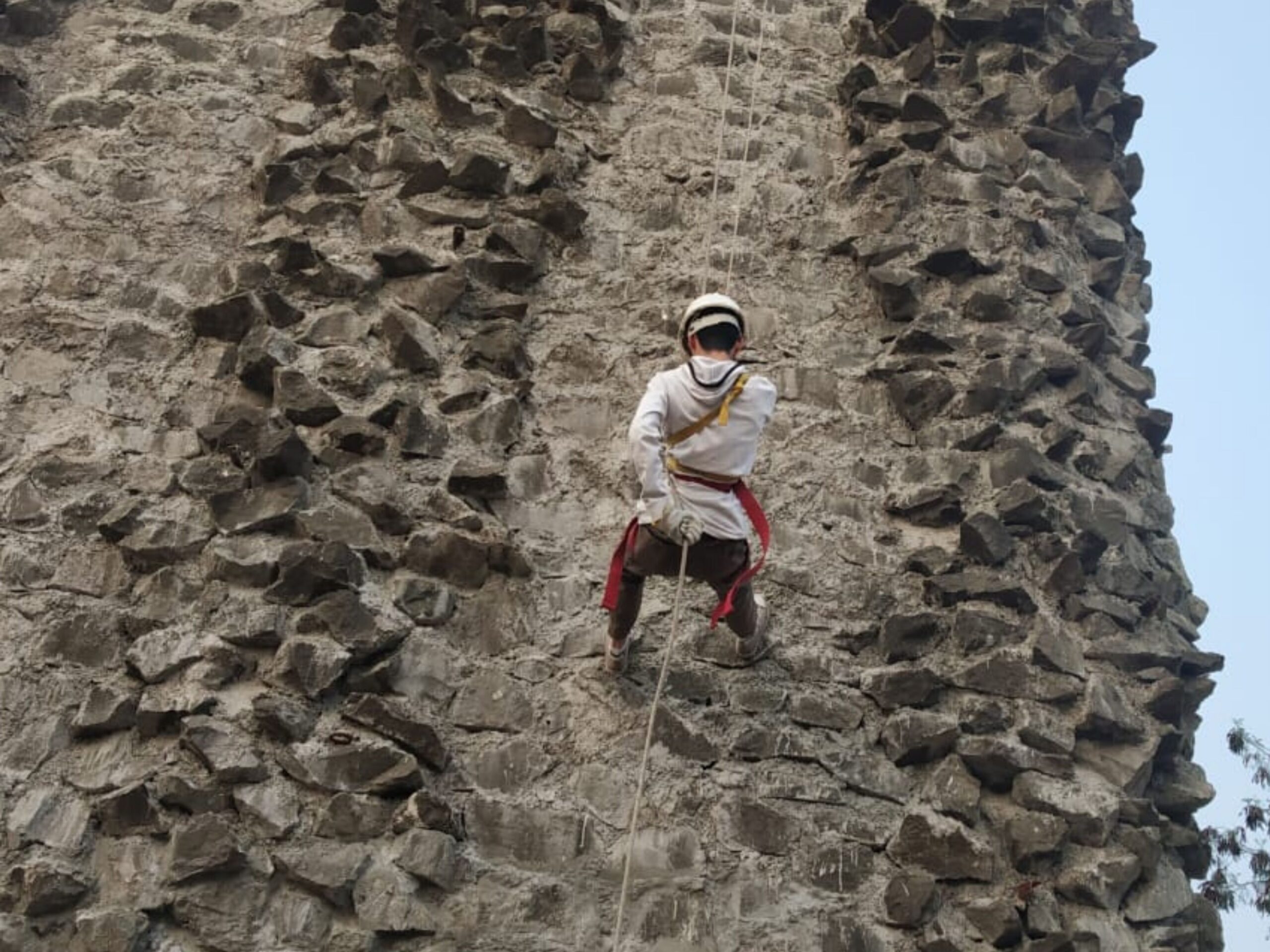 Rappelling is the technique of descending down a fixed rope on a rock-face or mountain side. The participants are secured safely to a harness and belay rope, which are handled by an instructor. The participants walk down backwards parallel to the ground at a 90 degree angle to the rock-face while the rope is let out slowly from their hands.